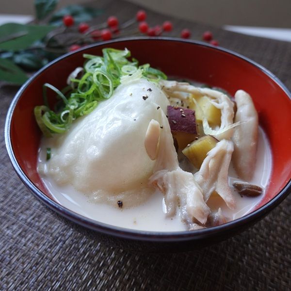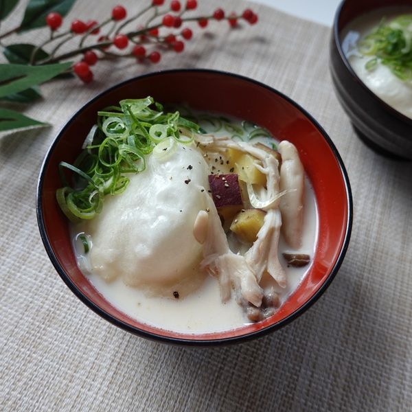 きのことさつまいも、お餅がとろけるやさしい豆乳みそスープ。